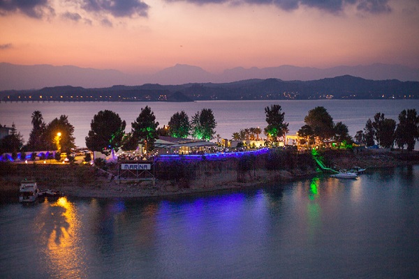 مطعم جنوب مارينا ويقع في شبه جزيرة تحيط به المياه من ثلاث