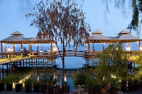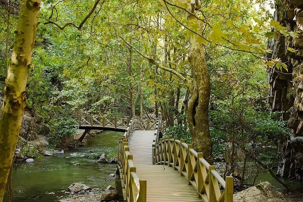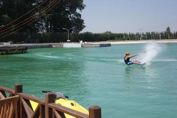 توجد ممرات للمشي ومسارح مفتوحة ضخمة وجسر ضخم فوق بركة اصطناعية.